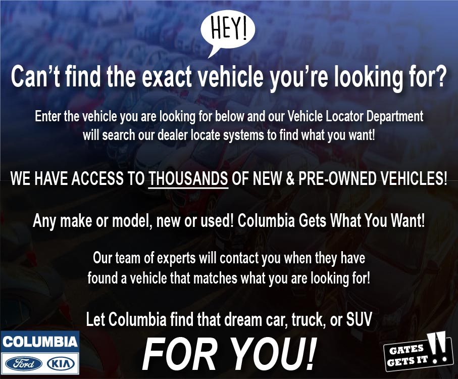 Columbia Ford Inc. offers a free, no obligation and confidential CarFinder tool, allowing you to specify your desired car, truck or SUV and submit the vehicle configuration to us. Once we locate matching automobiles, you automatically receive details of those models, with photographs included. Let us handle the task of finding your next dream car!